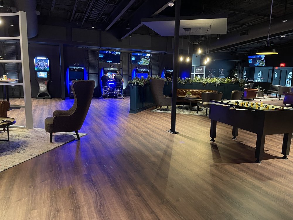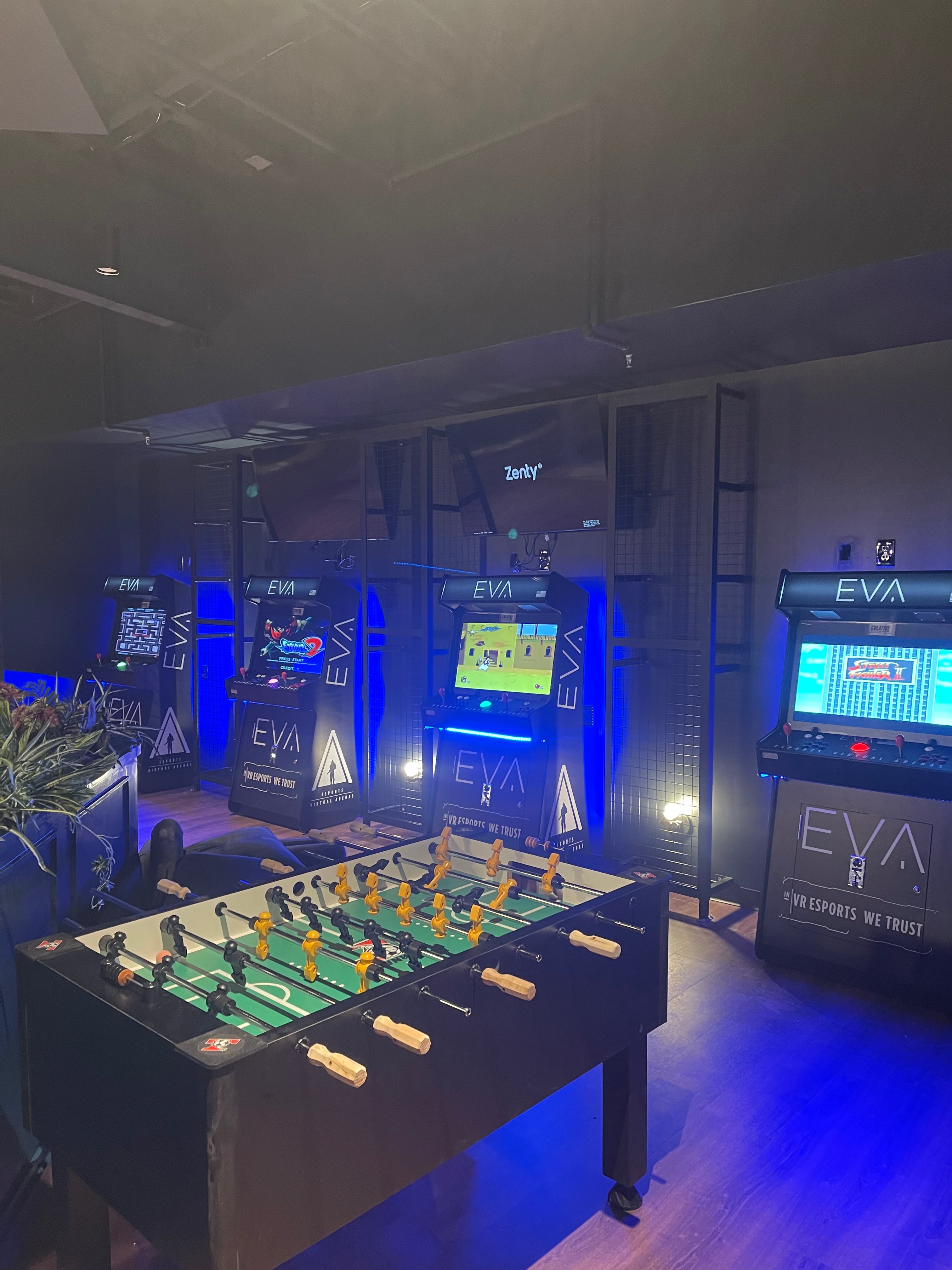 EVA now features over 10 of our commercial-grade arcade machines, strategically placed near their bar and snack zone so players can trade headsets for joysticks without missing a beat. Each machine is packed with 10,000 classic and modern titles, from Frogger and Metal Slug to 4-player showdowns that keep the competition alive off the virtual battlefield. We also gave each cabinet a custom wrap, designed in-house using only EVA’s logo. The result? A cohesive, branded arcade zone that feels like a natural extension of their futuristic arena—blending immersive storytelling with nostalgic swagger.