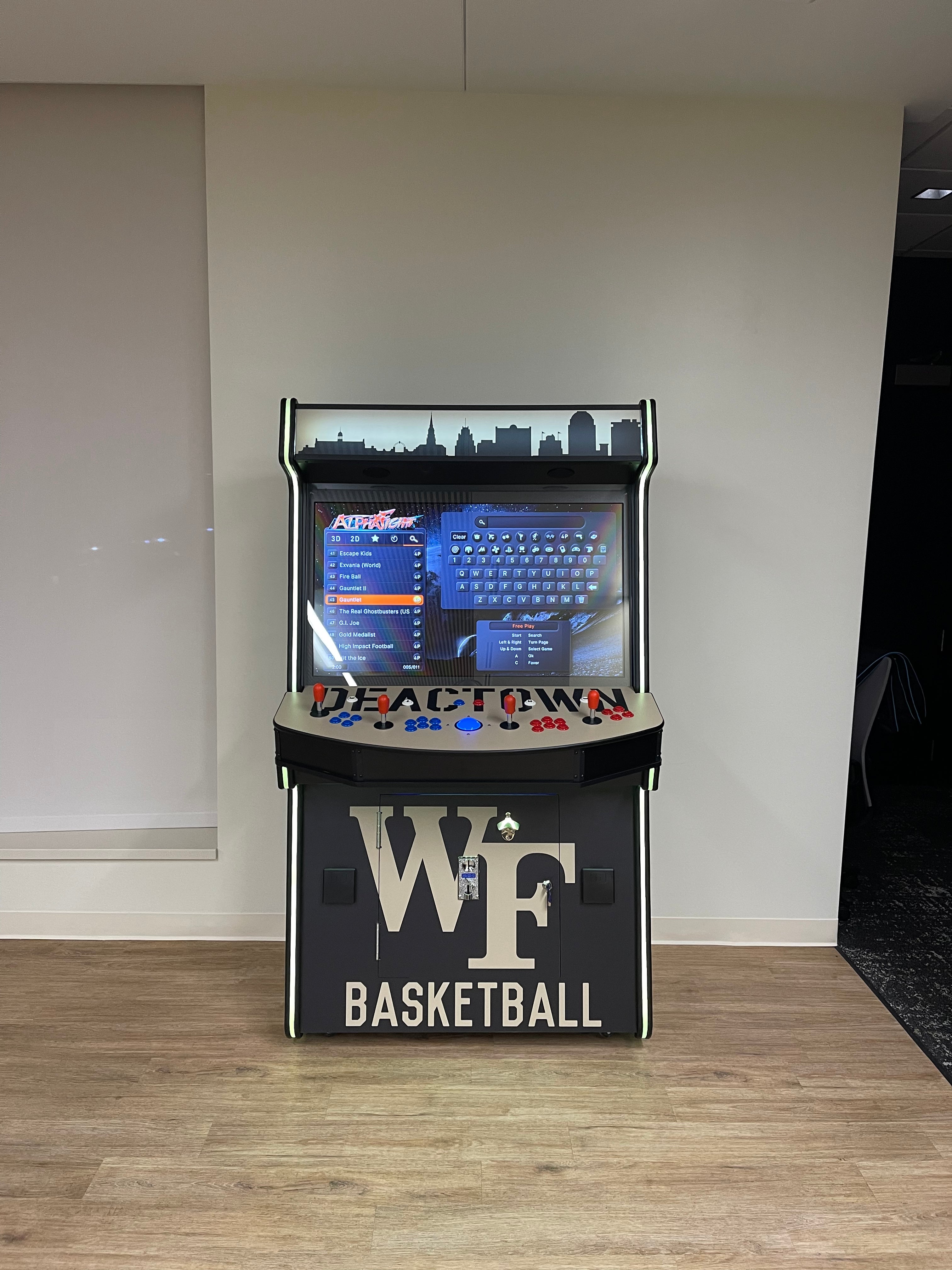 At Creative Arcades, we take pride in delivering commercial-grade arcade machines to top-tier institutions—and our recent installation at Wake Forest University’s women’s basketball program was a slam dunk. The team added our TR-1 Stand Up Arcade, featuring a massive 43” HD screen, 10,000 classic and modern games, vibrant LED lighting, and a glowing backlit marquee. Housed in their newly upgraded basketball facility, this cabinet wasn’t just placed—it was custom wrapped in Wake Forest black and gold, complete with the team’s logo, making it a standout centerpiece in their training and relaxation space. It’s a 4-player arcade—almost enough for the full starting five—perfect for post-practice team bonding or pregame competitive spirit.